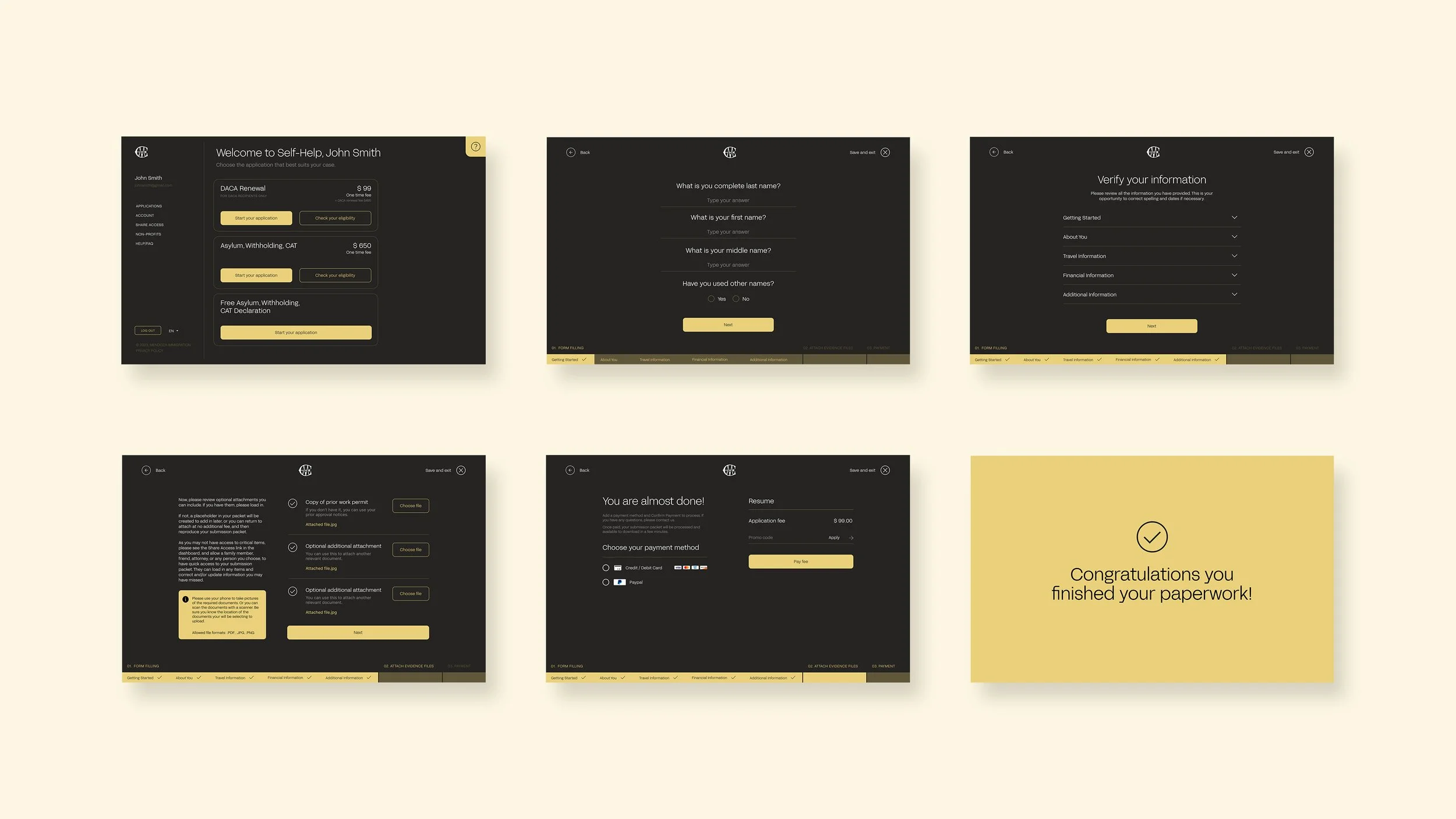 To hone my UX/UI design skills, I sought out projects needing improvement. Developer friends introduced me to a platform by a law firm that assists US immigrants with filling out legal immigration documents. Although the concept was excellent, the platform had several pain points that needed addressing. I worked to create a user-friendly platform that simplifies and guides users through the paperwork process more intuitively.